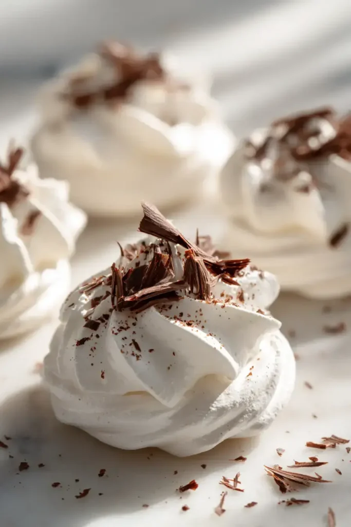 Learn how to make delicious Pavlovas Chantilly & Copeaux de Chocolat with this easy recipe featuring crisp meringue shells, whipped cream, and chocolate shavings.